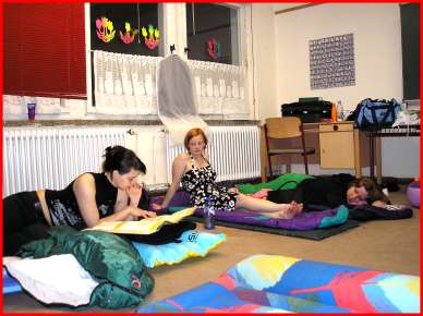 Der andere Teil der Unterkunft. Sonnabend: Jenny hat die Essenmarken gefunden und guckt in die Speisekarte. (Quatsch)! Draußen Regen, drinnen Jenny, Stephie und Uli.