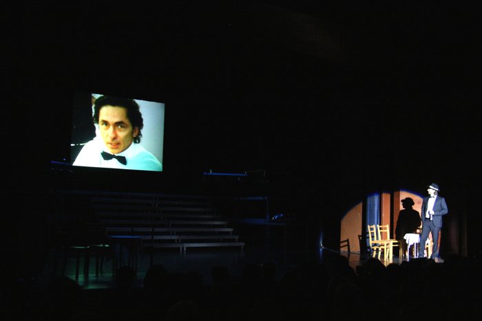 Thommy schaltet während seiner Begrüßung in die Maske zu Simon (auf der Leinwand) |