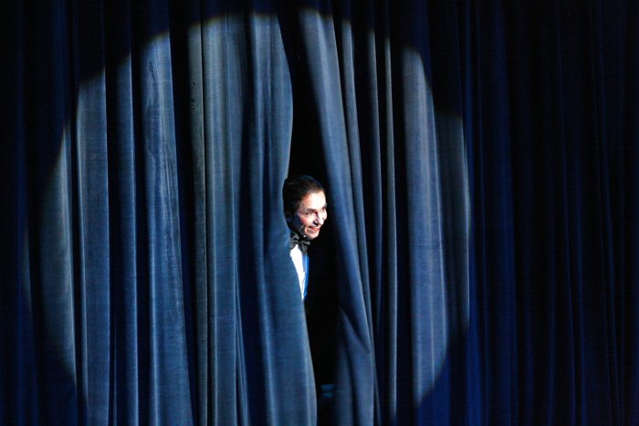Simon 40 Sekunden später komplett geschminkt und umgezogen mit falschen Wimpern als Confrancier für "Cabaret". |