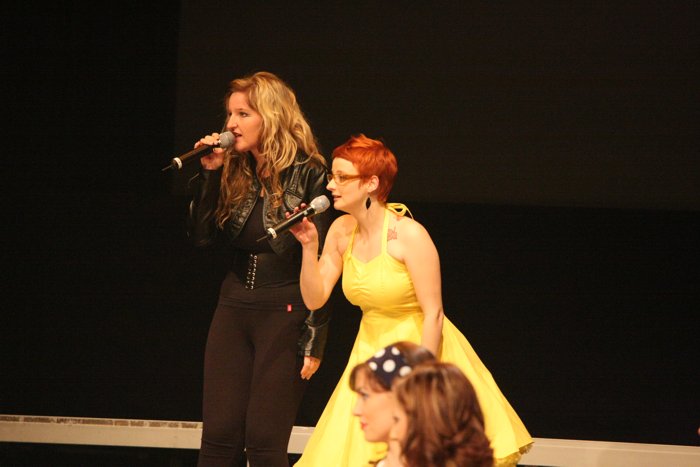 Nicole und Steph (2x Sandy, weil Rollensplitting) in der Rummelplatzszene aus "Grease". |