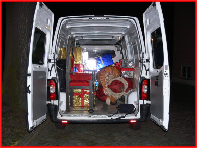 Dieser fette Weihnachtsmann fühlte sich im Stadttheater bei uns viel wohler, als hier im Transporter zwischen den ganzen Geschenken in stabiler Seitenlage. Transporter und Knecht Ruprecht verdanken wir dem TOOM-Baumarkt in Luckenwalde.