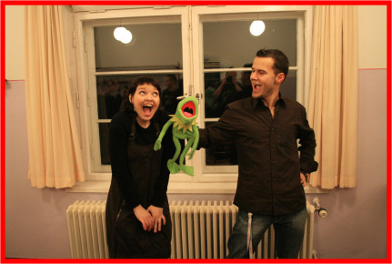 Ja, auch ein Frosch muß sich einsingen - v.l.n.r.: Jenny, Kermit und die Stimme von Kermit - Sebastian.
