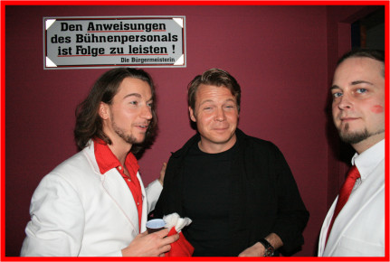 Auch die Herren passend für's erste Bühnenbild gekleidet (weiß mit roten Accessoires). Der Kreativität war da keine Grenze gesetzt, siehe Christian. Ausgenommen Steffen, weil der ja Schlagwerk bedienen mußte, statt singen.